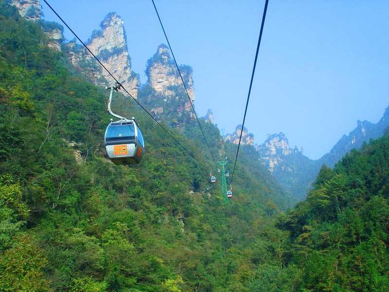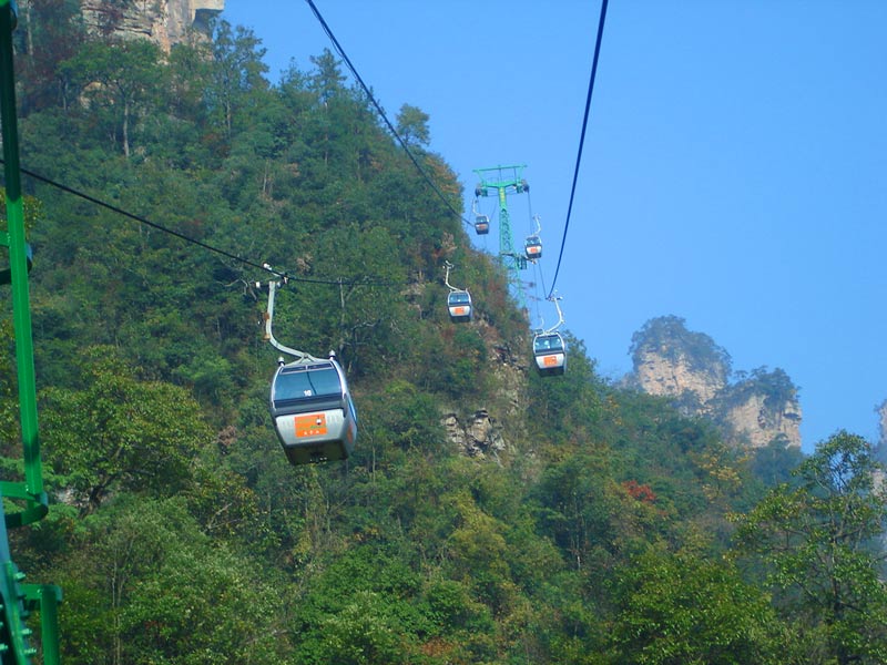 天子山索道 天子山索道的建成開通,極大地改善了武陵源風(fēng)景區(qū)的旅游交通環(huán)境,使游人花半日功夫上得天子山來只看一眼的遺憾,變成了間歇飛渡上山便可盡覽天子山這“擴(kuò)大的盆景,縮小的仙境”的迷人景色之享受。乘坐天子山索道,既舒適又安全,沿線風(fēng)光奇絕,奇松怪石,莽莽翠林,幽幽泉水,嬉戲獼猴,盡收眼底,令人嘆為觀止。尤其在云霧繚繞之時(shí),游客乘坐索道更能體驗(yàn)到神仙飄逸飛行的動(dòng)感與刺激。