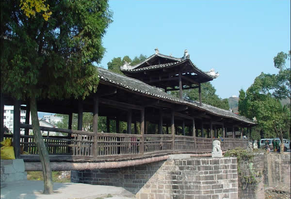 | 賀龍橋原名永安橋,是賀龍曾祖父賀廷宰首倡修建的,它是一座由石墩、木梁、騎廊組成的風(fēng)雨橋。賀廷宰熱心公益事業(yè),見玉泉河“奔流湍急,道路為!,行人十分不便,于是決定修橋。由于他只是一個教私塾的文人,修橋工程艱巨,個人經(jīng)費有限,“至斥腴畝以償其負(fù)”。后來,賀龍的祖父賀良仕子代父勞,費盡心血,終于在1915年修建成功,深獲遠(yuǎn)近鄉(xiāng)鄰稱頌。