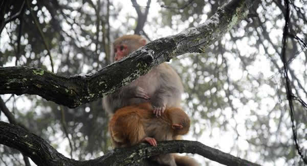 面對白雪紛飛的天氣,景區(qū)游道上原來常見的猴群突然不見了蹤影,這些可愛的獼猴去哪兒了?筆者在黃石寨景區(qū)經過一番探究發(fā)現,獼猴去處大致有三:一是在山峰懸崖石臺處避風雪;二是在大樹樹枝上躲風雪;三是在游道旁的雜草中找溫暖。那么,這些獼猴靠什么維持生存呢?主要是靠吃樹葉,另外到訪游人攜帶的食品常常成為獼猴爭奪的“獵物”。