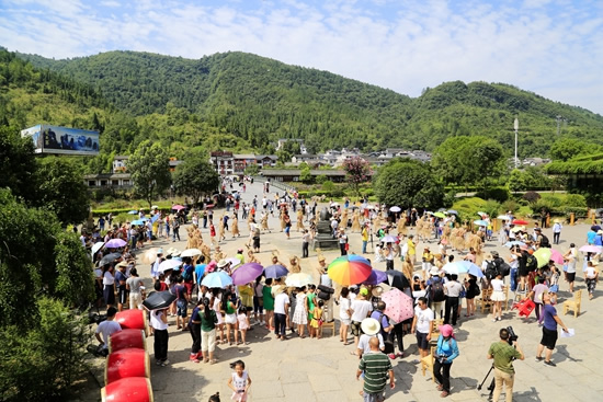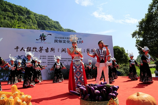 7月29日上午9點(diǎn)30分,由張家界市人民政府主辦,張家界市委宣傳部、市旅游和外事僑務(wù)委員會、市文體廣電新聞出版局、武陵源區(qū)人民政府承辦,黃龍洞景區(qū)協(xié)辦的“絕版張家界,最炫民族風(fēng)”張家界民俗活動月第三場活動在黃龍洞景區(qū)啟動,F(xiàn)場以土家人慶祝豐收的鼓舞拉開序幕,土家鼓舞歡悅的節(jié)奏,夸張的舞姿開場就吸引了幾千游人和當(dāng)?shù)厝擞^看。草根夫妻檔歌手,張家界“山水組合許勇、舒維亮麗的服飾,野性的嗓音……”以一首《我在高山唱》歌曲,征服現(xiàn)場游客,贏得雷鳴般的叫好聲。